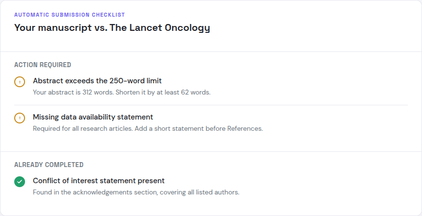 It's the piece most researchers do by hand right now: opening a PDF of author guidelines in one window, the manuscript in another, and checking abstract word counts, required statements, figure resolution, and a dozen other things one at a time. We built this feature so you don't have to.
